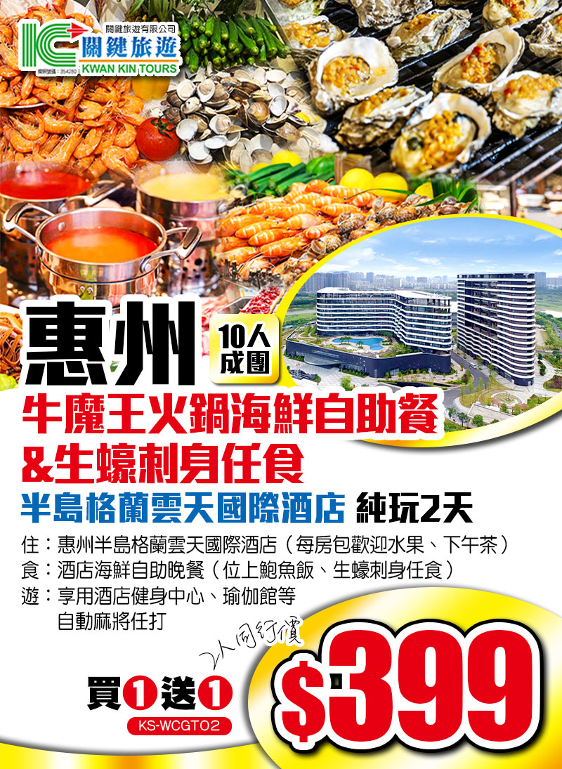 【 買一送一】惠州半島格蘭雲天國際酒店 牛魔王火鍋海鮮自助餐生蠔刺身任食 純玩2天(10人成團)2人同行價只要399!
