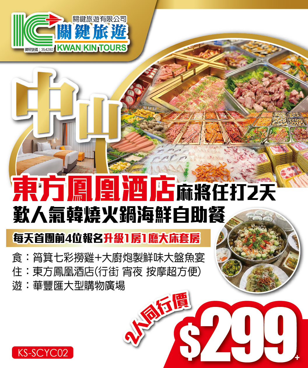【2人同行價只要299+!】中山東方鳳凰酒店 歎人氣韓燒火鍋海鮮自助餐 電動麻將任打2天