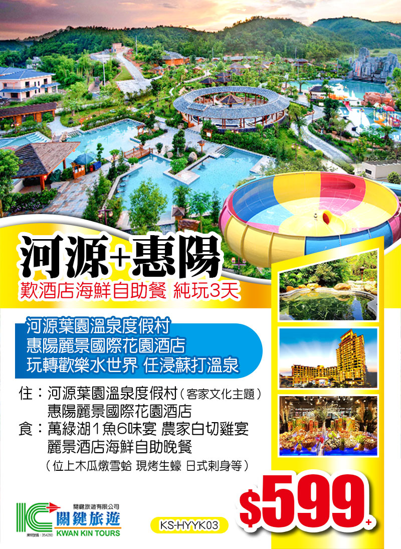 河源葉園溫泉度假村+惠陽麗景國際花園酒店 玩轉歡樂水世界 任浸蘇打溫泉 歎酒店海鮮自助餐 純玩3天 只需599+!