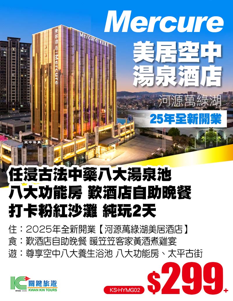 2025年全新開業 河源萬綠湖【美居空中湯泉酒店】 任浸古法中藥8大湯泉池 8大功能房 酒店自助晚餐 純玩2/3天 只要299+!