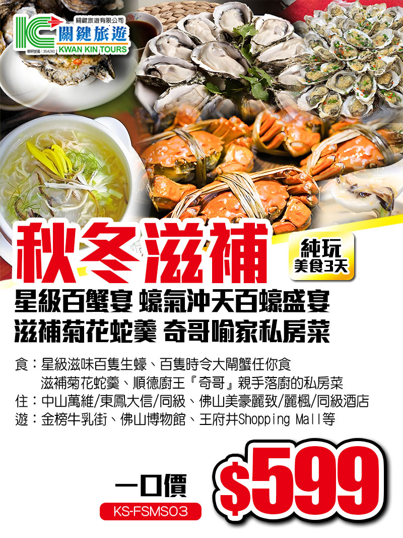 橫行霸道星級百蟹宴、蠔氣沖天百蠔盛宴 滋補菊花蛇羹 奇哥喻家私房菜 純玩美食3天 只要599一口價!