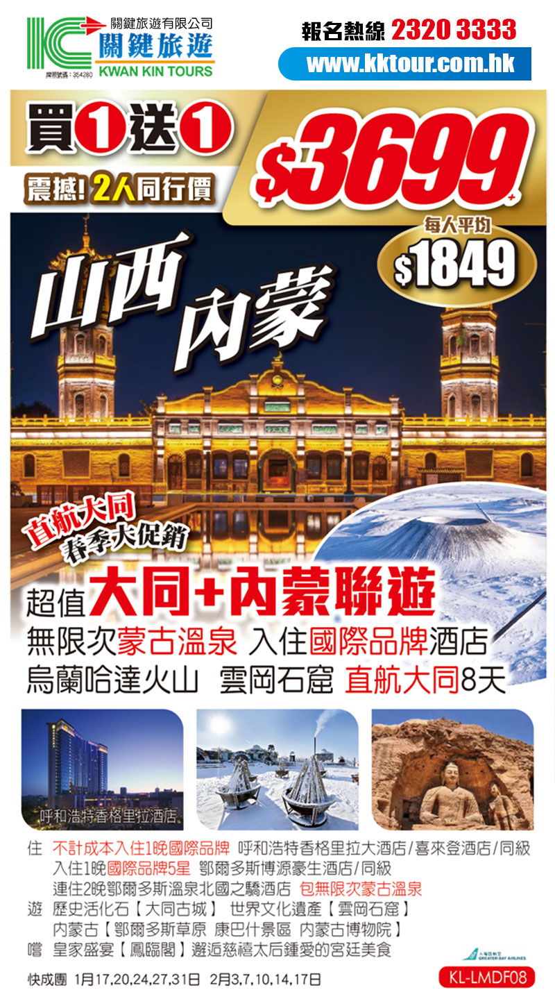 【震撼!買1送1】2人同行價只要3699!每人平均1849!山西內蒙聯遊 直航大同8天!玩轉大同雲岡石窟 內蒙烏蘭哈達火山 鄂爾多斯草原 入住【國際品牌】酒店 包泡蒙古溫泉!