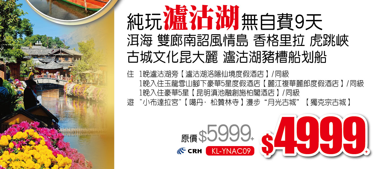 純玩【七彩雲南】住在玉龍雪山腳下超5星度假酒店 大理 麗江古城 品海景下午茶 高鐵6/9天 只要3199+!