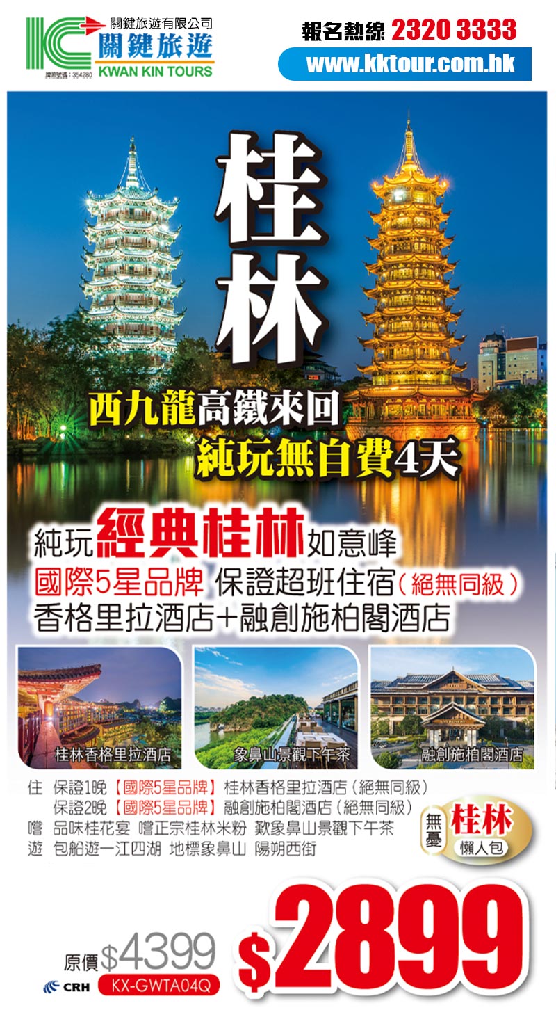西九龍往返【純玩經典桂林】如意峰 【國際品牌】香格里拉+ 融創施柏閣 4天 只要2899+!