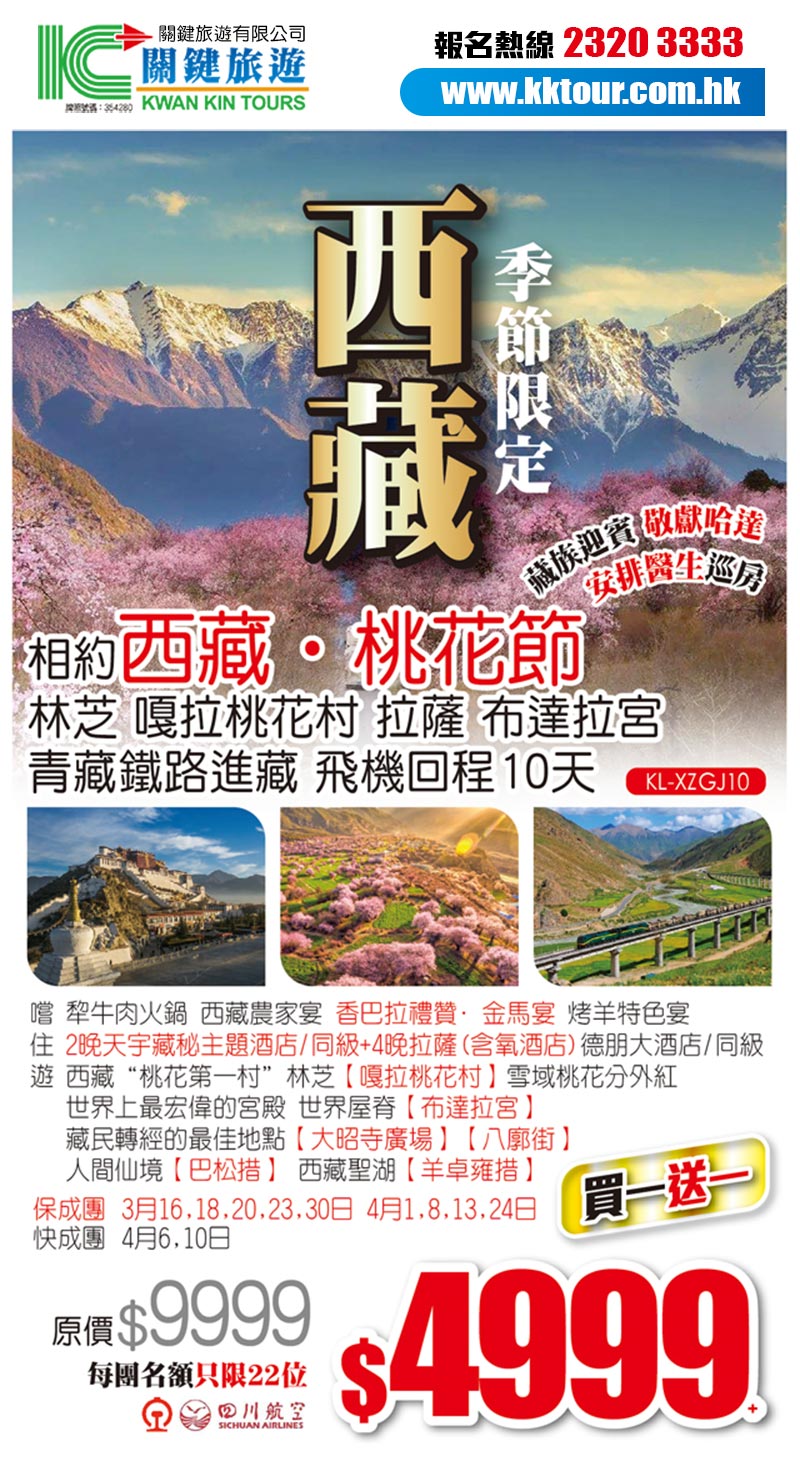 【買一送一】4999!先到先得【相約西藏•桃花節 低海拔進藏】林芝嘎拉桃花村 拉薩布達拉宮 青藏鐵路 單飛單臥10天