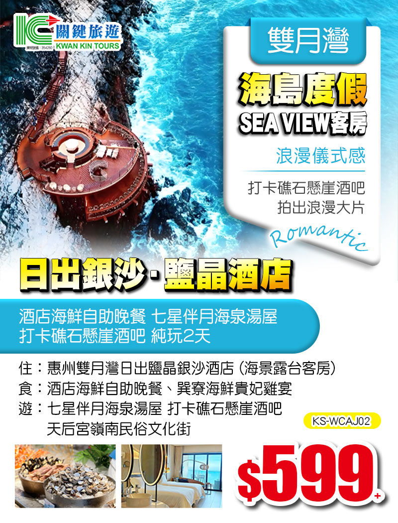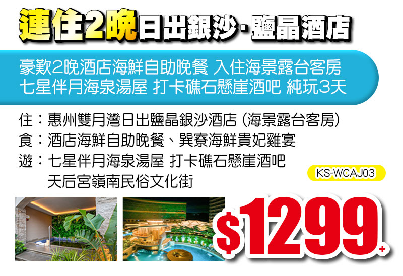 【新推介】雙月灣 日出鹽晶 · 銀沙酒店(入住海景露台房)酒店海鮮自助晚餐 七星伴月海泉湯屋 打卡礁石懸崖酒吧 純玩2/3天