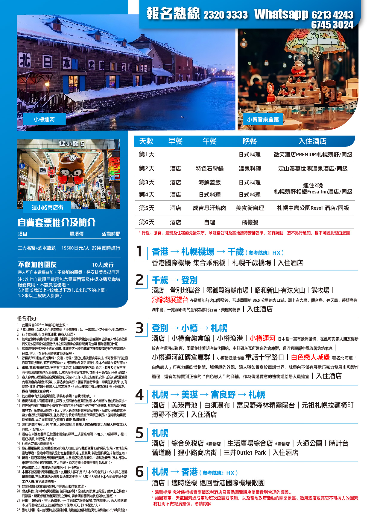 酒店早餐→小樽音樂盒館(小樽音樂盒堂本館前高達5米的蒸汽時鐘每隔15分鐘便會噴出蒸汽,奏出5個音階的旋律。館內出售有約3,400種音樂盒,總數達25,000件以上。遊客可在附近的小樽音樂盒堂2號館古董博物館中傾聽伊奧利亞管風琴演奏的“天籟”,體驗各種珍貴的古董音樂盒)→小樽漁港→小樽運河(日本唯一富有歐洲風情,在此可與家人朋友漫步於古老運河街道裏,周圍並排著明治時代開始,由紅磚灰瓦所建造的倉庫群,運河旁寧靜中飄流著悠悠氣息)→小樽運河紅磚倉庫群(小樽運河沿岸的紅磚倉庫,印證了小樽身為國際港都的全盛時間,小樽運河現雖已失去舊日的經濟作用,但岸邊的石倉庫仍然保留,化身為餐廳、酒吧等,熱鬧依然,與運河組合成一幅美麗的風景畫,是北海道觀光的勝景)→小樽最浪漫地標-童話十字路口(小樽極具代表性的特色地景,街道周圍完整保留許多日本明治到大正年間(約於 19 世紀末至 20 世紀初) 所建造的歐式樓房)→白色戀人城堡(著名北海道「白色戀人」巧克力餅乾博物館,城堡般的外觀,讓人猶如置身於童話世界。其色彩鮮豔的磚牆、造型各異的尖頂、氣勢恢宏的城堡、古樸典雅的鐘樓,每一處都突顯莊重大方的氣息。城堡內不僅有展示巧克力發展史和製作過程的巧克力博物館,還有能夠買到正宗的“白色戀人”的商鋪,作為傳遞愛意的禮物送給戀人最適宜)→入住酒店