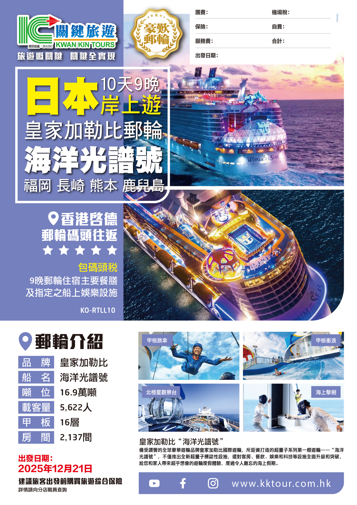 皇家加勒比郵輪【海洋光譜號】香港-福岡-長崎-熊本-鹿兒島-香港10天9晚船票