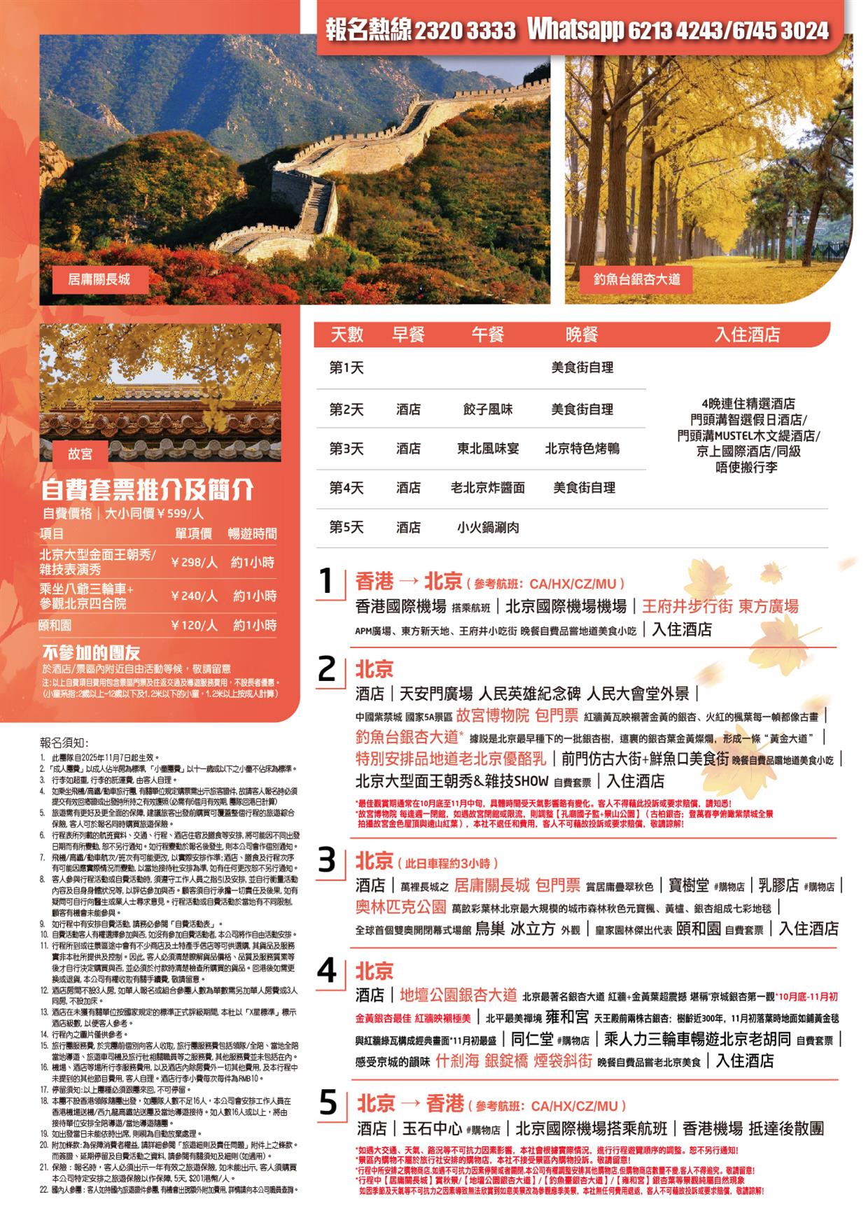 *行程中【居庸關長城】賞秋景/【地壇公園銀杏大道】/【釣魚臺銀杏大道】/【雍和宮】銀杏葉等景觀純屬自然現象,如因季節及天氣等不可抗力之因素導致無法欣賞到如意美景改為參觀應季美景,本社無任何費用退返,客人不可藉故投訴或要求賠償,敬請諒解!