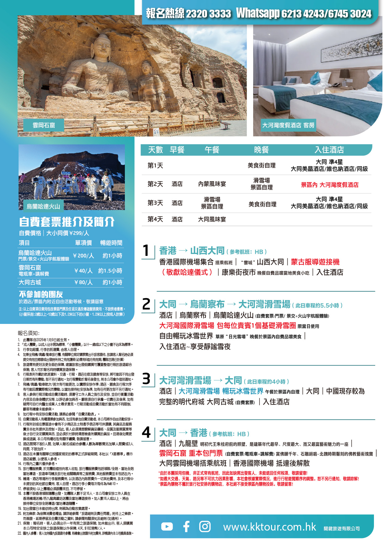 【純玩•山西內蒙古•烏蘭察布 大河灣滑雪場】大同古城 雲岡石窟 二省聯遊 抵玩直航4天
