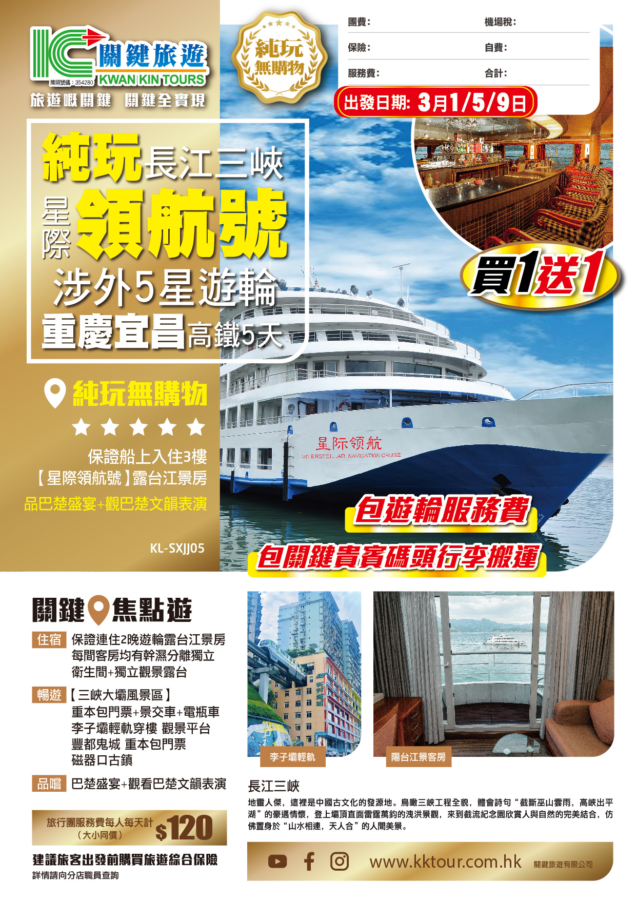 買一送一 純玩無購物【長江三峽】涉外5星遊輪《星際領航號》三峽大壩 重慶宜昌高鐵5天