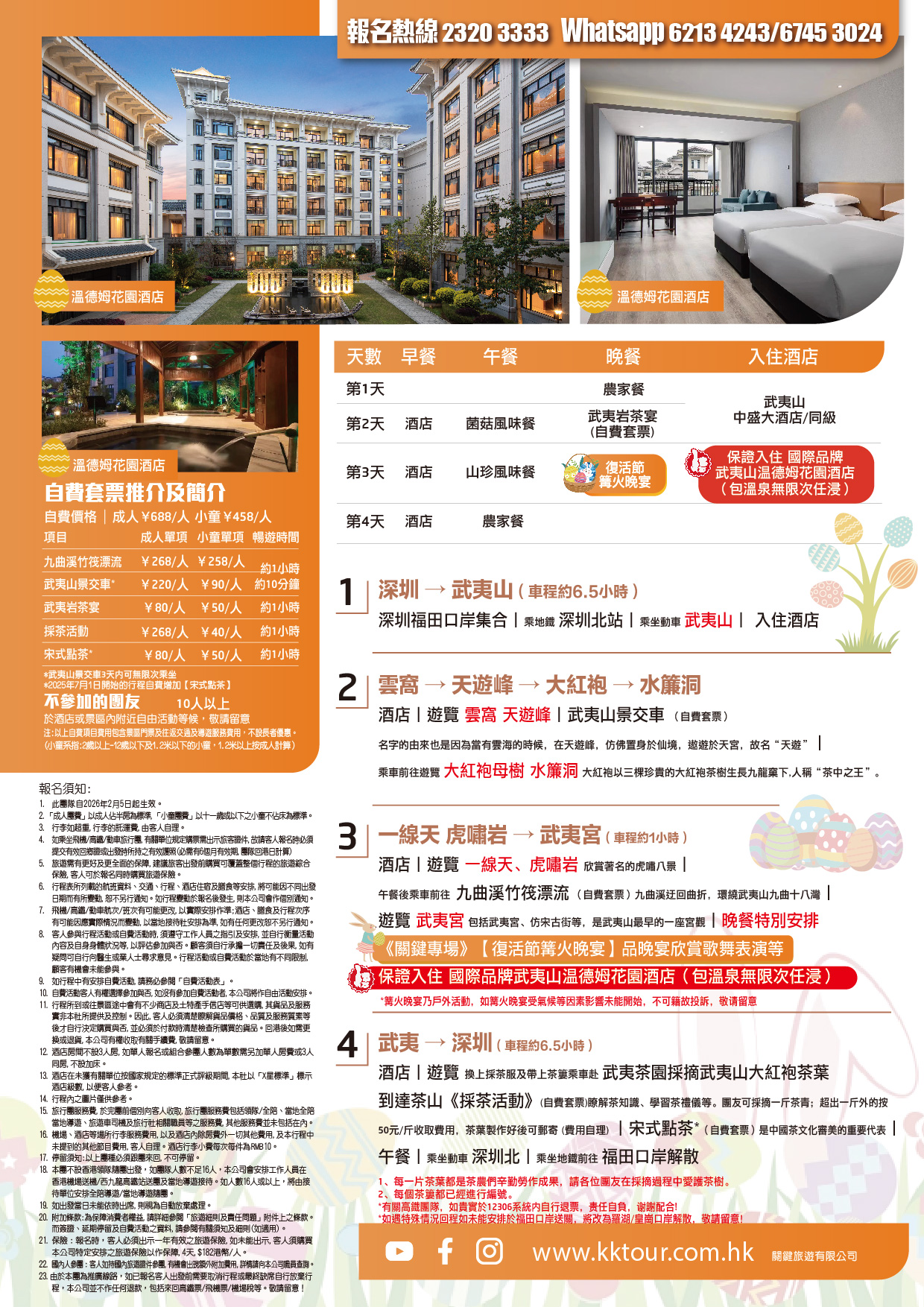 酒店→遊覽換上採茶服及帶上茶簍乘車赴武夷茶園採摘武夷山大紅袍茶葉→茶山《採茶活動》(自費套票)~瞭解茶知識、學習茶禮儀等(團友可採摘一斤茶青,超出一斤外的按50元/斤收取費用),茶葉製作好後可郵寄 (費用自理)。【宋式點茶】(自費套票)是中國茶文化審美的重要代表 ∣ →午餐後乘坐高鐵回深圳解散,行程圓滿結束!