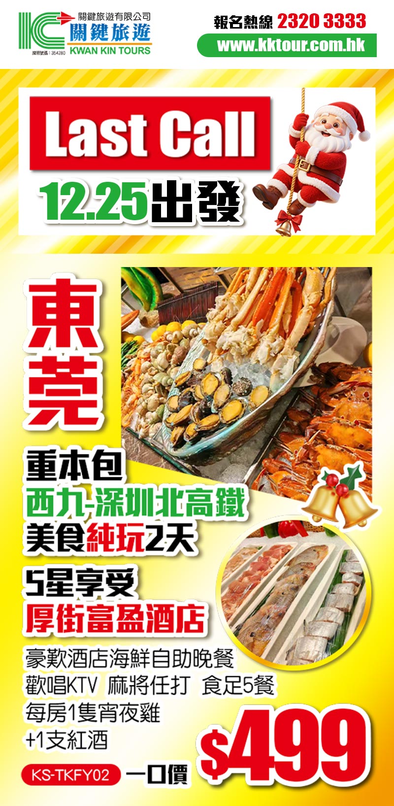 【聖誕Last Call】東莞5星享受厚街富盈酒店 豪歎酒店海鮮自助晚餐 歡唱KTV 麻將任打 純玩2天 只要499!!!