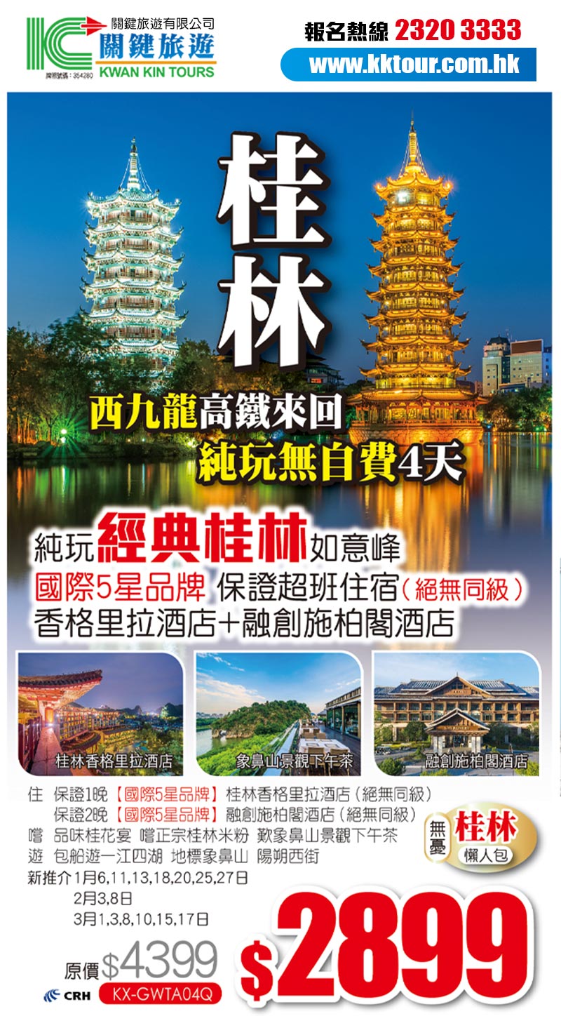 西九龍往返【純玩經典桂林】如意峰 【國際品牌】香格里拉+ 融創施柏閣 4天 只要2899+!