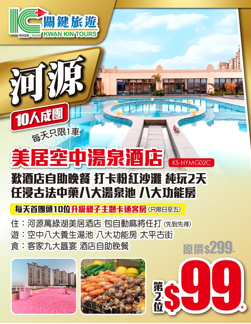 【10人成團】2人同行 第2位只需99+!河源萬綠湖美居空中湯泉酒店 歎酒店自助晚餐 任浸湯泉 純玩2天