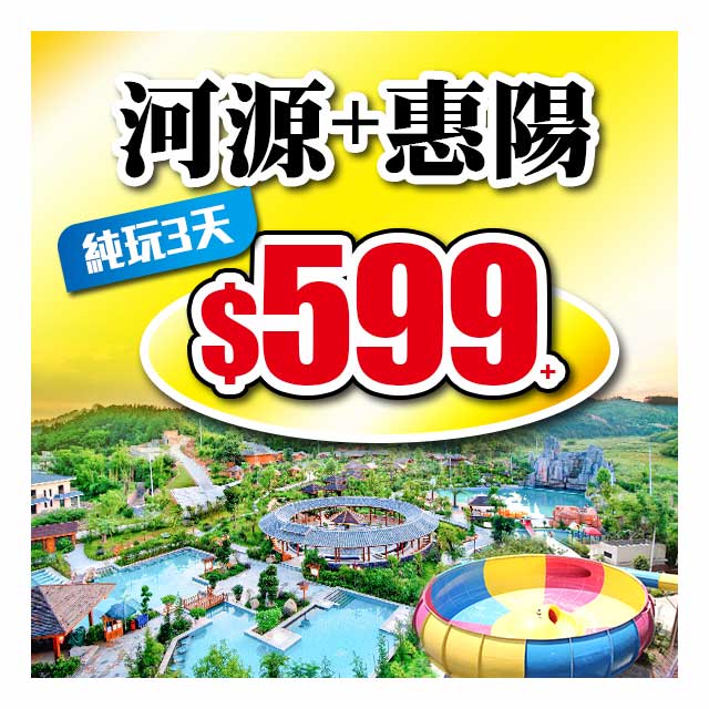 河源葉園溫泉度假村+惠陽麗景國際花園酒店 玩轉歡樂水世界 任浸蘇打溫泉 歎酒店海鮮自助餐 純玩3天 只需599+!
