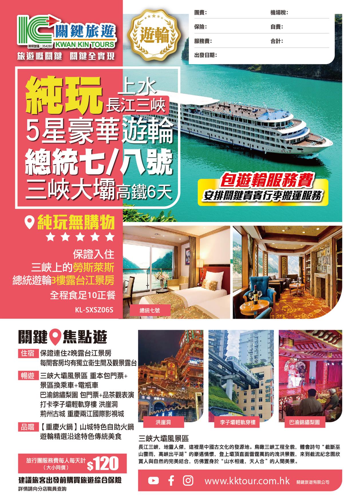 純玩【長江三峽】5星豪華遊輪《總統七/八號》 保證入住3樓露台房 [包遊輪服務費] 高鐵上水 6天