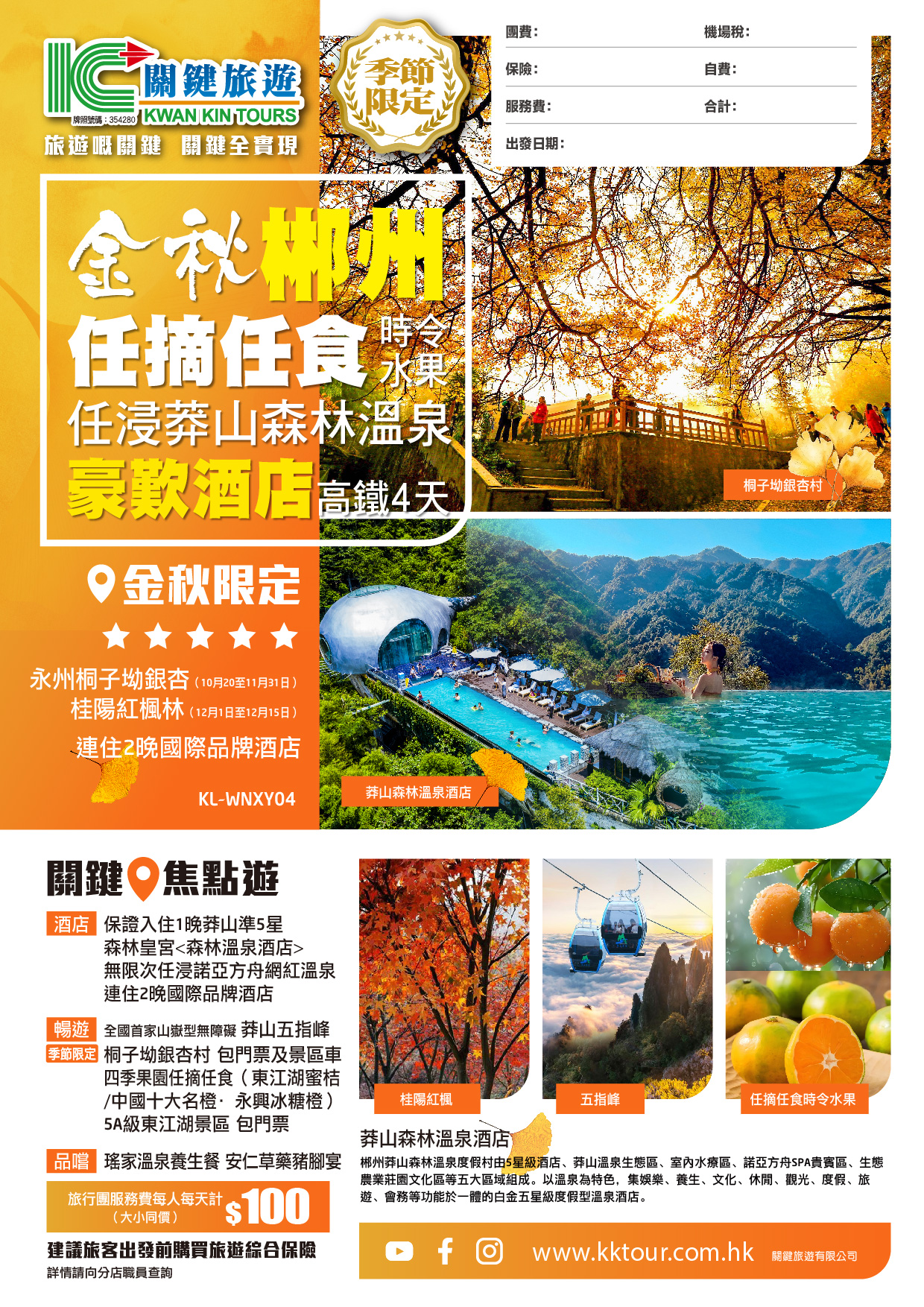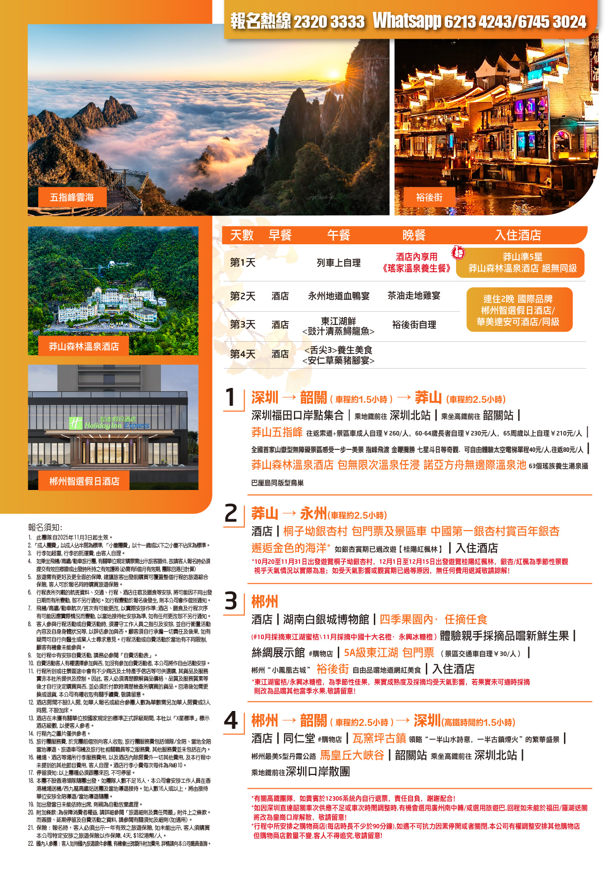 注:10月20至11月31日出發遊覽桐子坳銀杏村,12月1日至12月15日出發遊覽桂陽紅楓林,銀杏/紅楓為季節性景觀,視乎天氣情況以實際為准;如受天氣影響或觀賞期已過等原因,無任何費用退減敬請諒解
