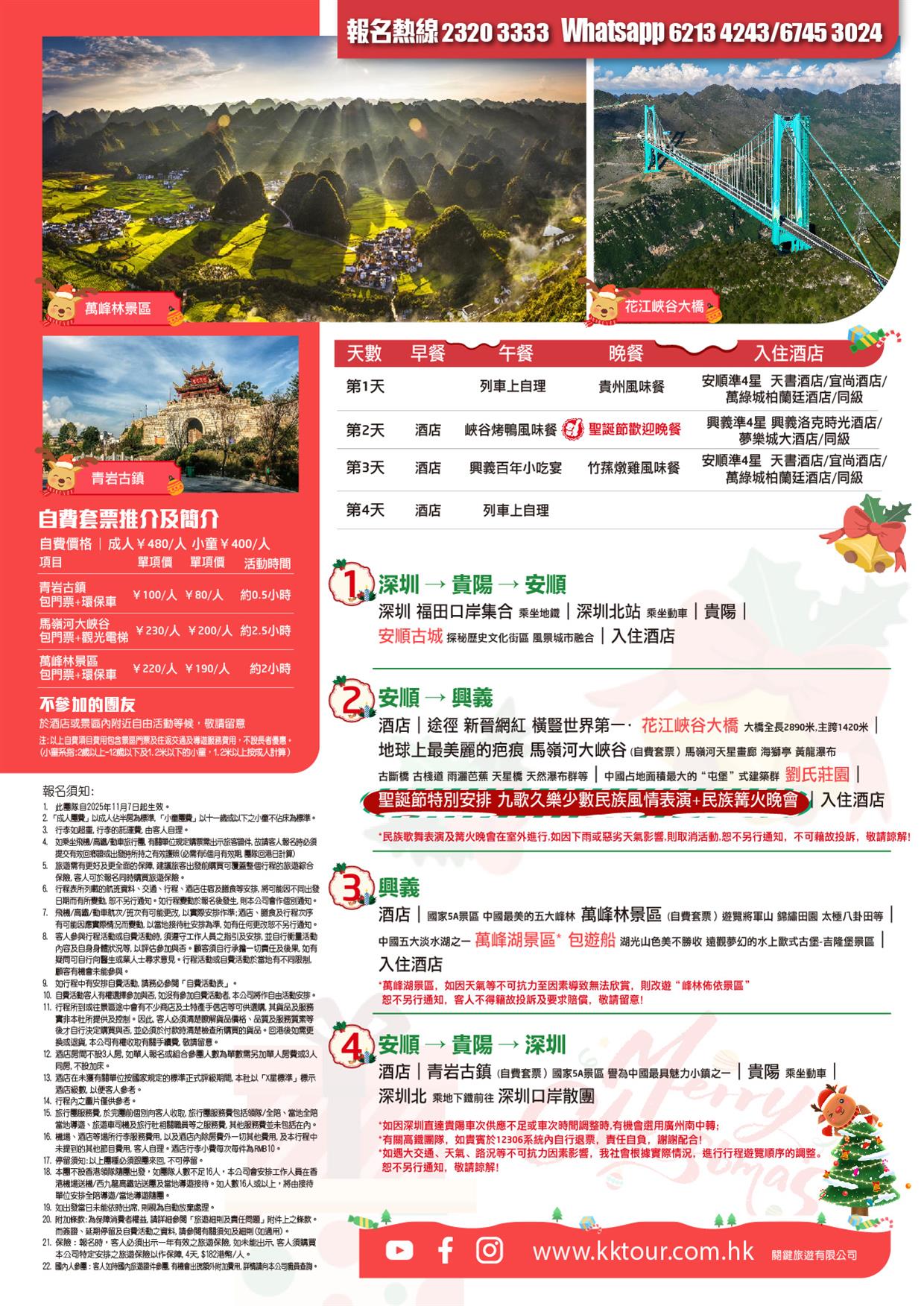 酒店 |途徑 新晉網紅 橫豎世界第一·花江峽谷大橋 大橋全長2890米,主跨1420米 | 地球上最美麗的疤痕 馬嶺河大峽谷 (自費套票)馬嶺河天星畫廊 海獅亭 黃龍瀑布 古斷橋 古棧道 雨灑芭蕉 天星橋 天然瀑布群等| 中國占地面積最大的“屯堡”式建築群 劉氏莊園 | 聖誕節特別安排:九歌久樂少數民族風情表演+民族篝火晚會 | 入住酒店