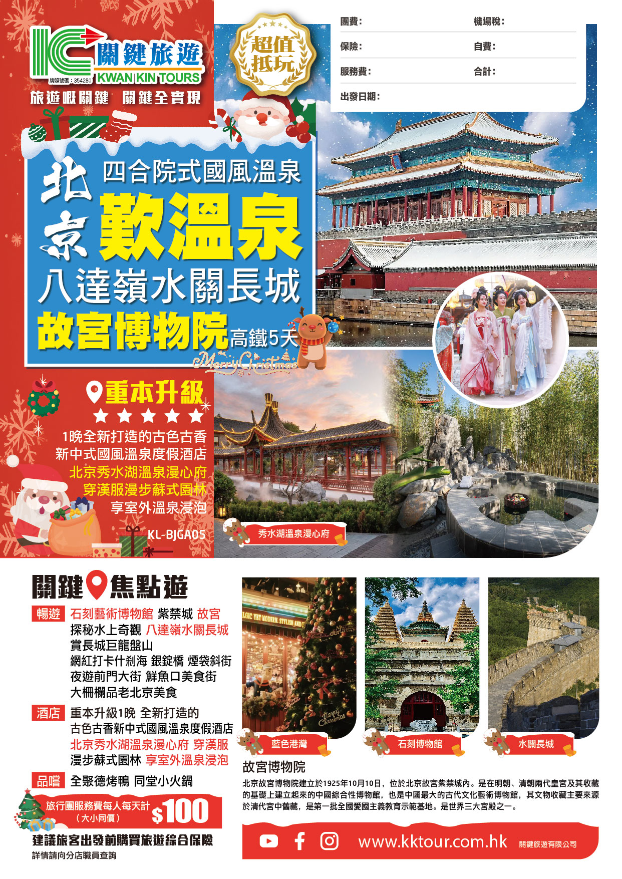 【北京•四合院式國風溫泉度假酒店歎溫泉】故宮博物院 萬里長城之八達嶺水關長城 超值高鐵5天