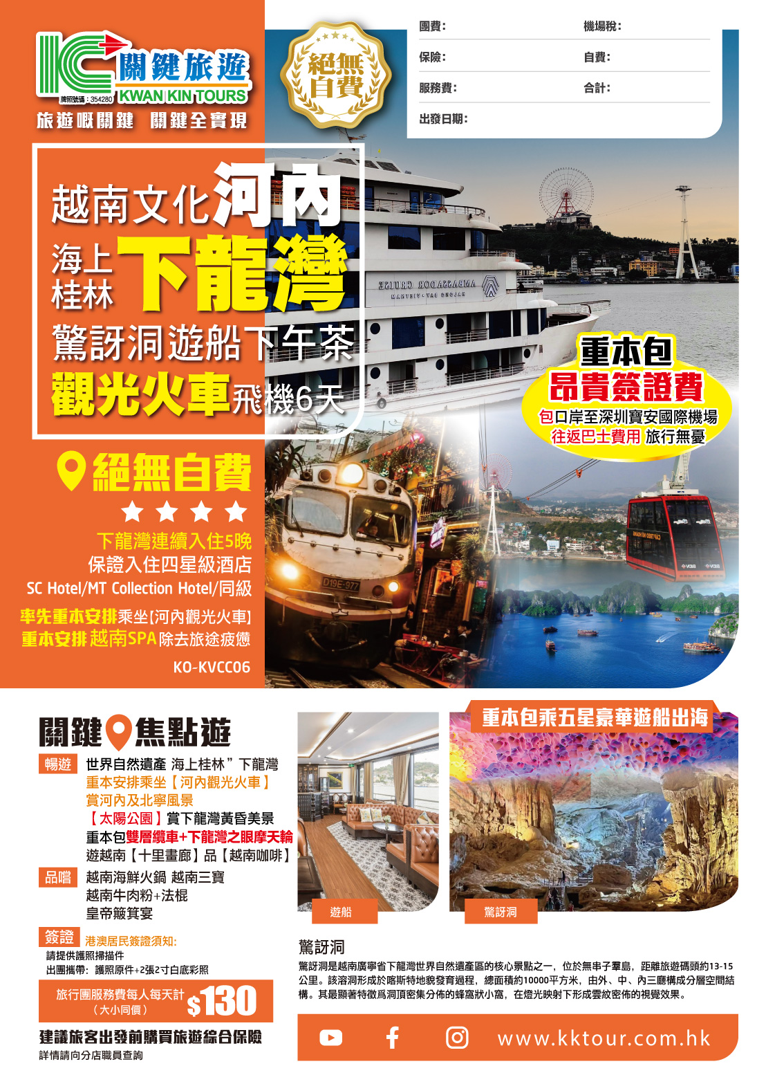 【越南文化•乘觀光火車遊河內 下龍灣乘豪華遊船】品越式下午茶 太陽公園摩天輪 飛機6天