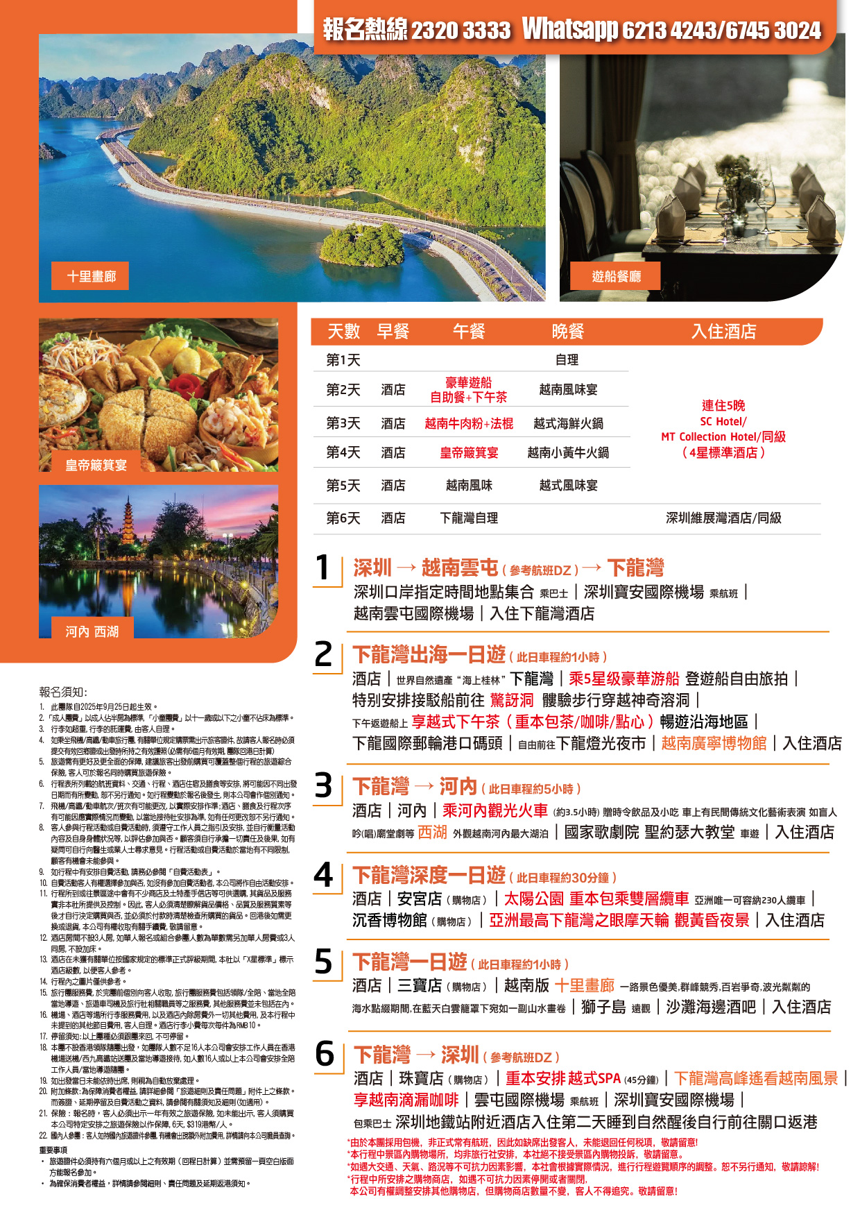 酒店早餐→珠寶店(購物店)→重本安排【越式SPA】(約45分鐘)→下龍灣高峰遙看越南風景;→享【越南滴漏咖啡】→雲屯國際機場搭乘航班→深圳寶安國際機場→包乘巴士前往深圳地鐵站附近酒店入住,第二天睡到自然醒後自行前往關口返港。