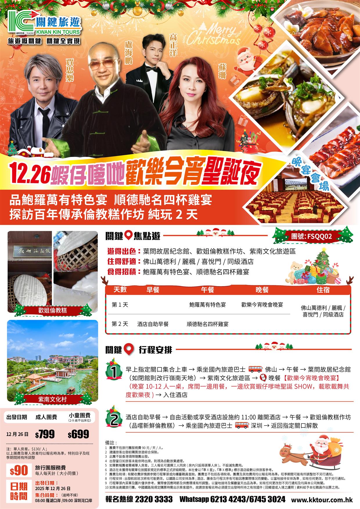 早上指定關口集合上車→乘坐國內旅遊巴士→佛山→午餐→葉問故居紀念館(如閉館則改行嶺南天地)→紫南文化旅遊區→晚餐【明星晚宴】(晚宴10-12人一桌,席間一邊用餐,一邊欣賞蝦仔嗲哋聖誕SHOW,載歌載舞共度歡樂夜)→入住酒店
