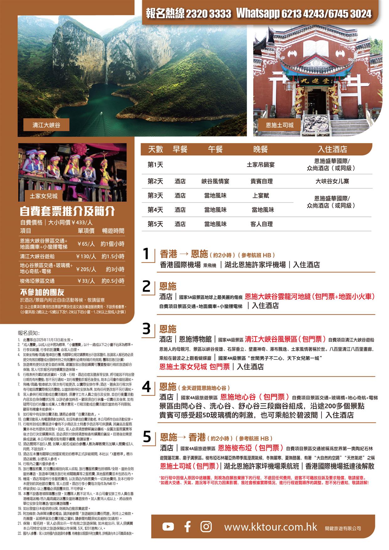酒店 | 國家 AAAA 級旅遊景區【恩施梭布埡(包門票)】自費項目景區交通被稱爲世界第一奧陶紀石林,遊覽蓮花寨、磨子溝景區。梭布埡石林屬亞熱帶季風溼潤氣候,冬無嚴寒,夏無酷暑,有著 “大自然的空調”“天然氧吧” 之 | 【恩施土司城(包門票)】 | 湖北恩施許家坪機場乘航班 | 香港國際機場抵達後解散