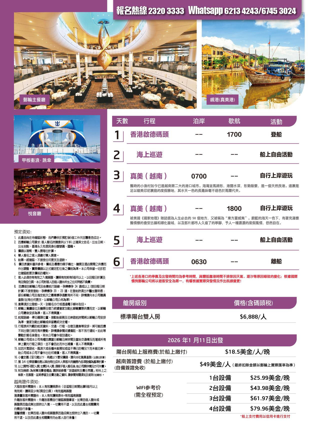 熱線電話 : 2320 3333 旅遊咨詢 WhatsApp : 6745 3024 / 6213 4243