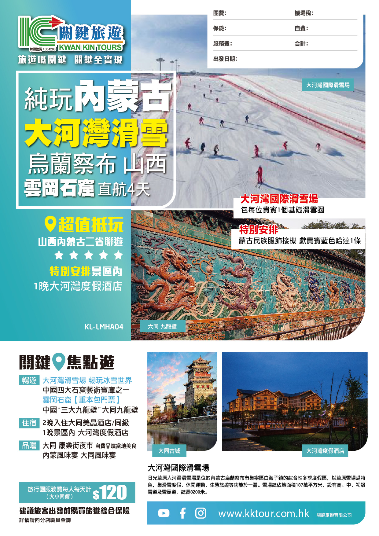 【純玩•山西內蒙古•烏蘭察布 大河灣滑雪場】大同古城 雲岡石窟 二省聯遊 抵玩直航4天