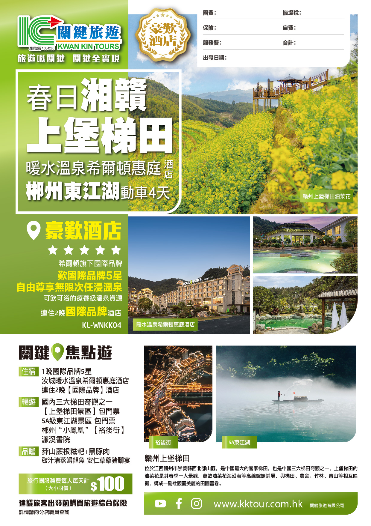 【郴州+贛州】春日湘贛 贛州上堡梯田油菜花 郴州東江湖 汝城暖水溫泉希爾頓惠庭 動車4天
