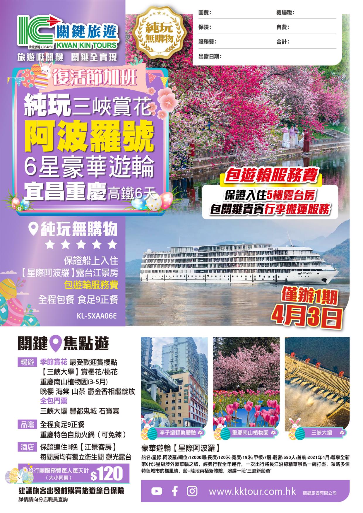復活節加班 純玩【長江三峽賞花】6星豪華遊輪《阿波羅號》保證入住5樓露台房 宜昌重慶 高鐵6天