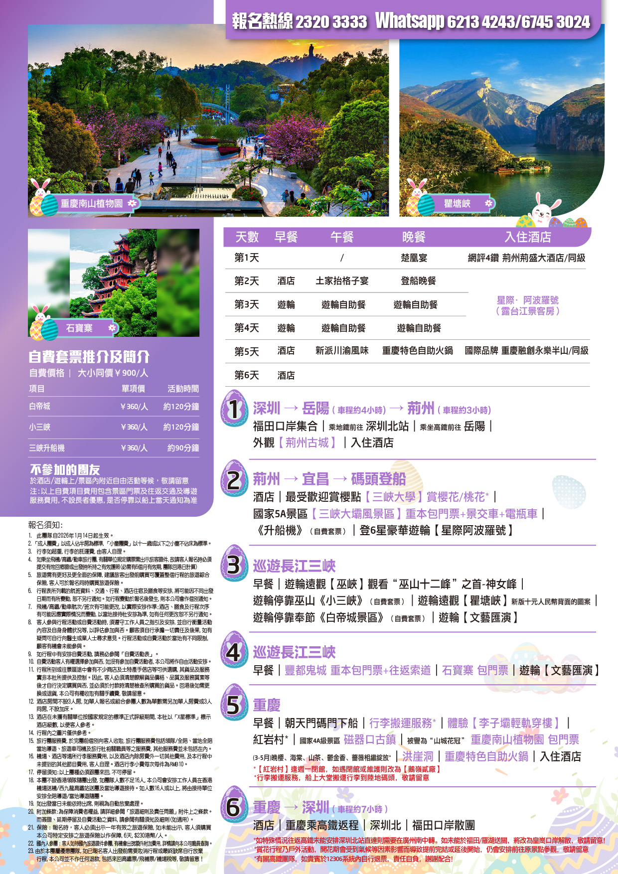 早餐→朝天門碼門下船→行李搬運服務*→體驗【李子壩輕軌穿樓】→【紅岩村】*→國家4A級景區【磁器口古鎮】→被譽為“山城花冠”【重慶南山植物園】包門票 (3-5月)晚櫻、海棠、山茶、鬱金香、薔薇相繼綻放*→網紅打卡【洪崖洞】→【重慶特色自助火鍋】→入住酒店