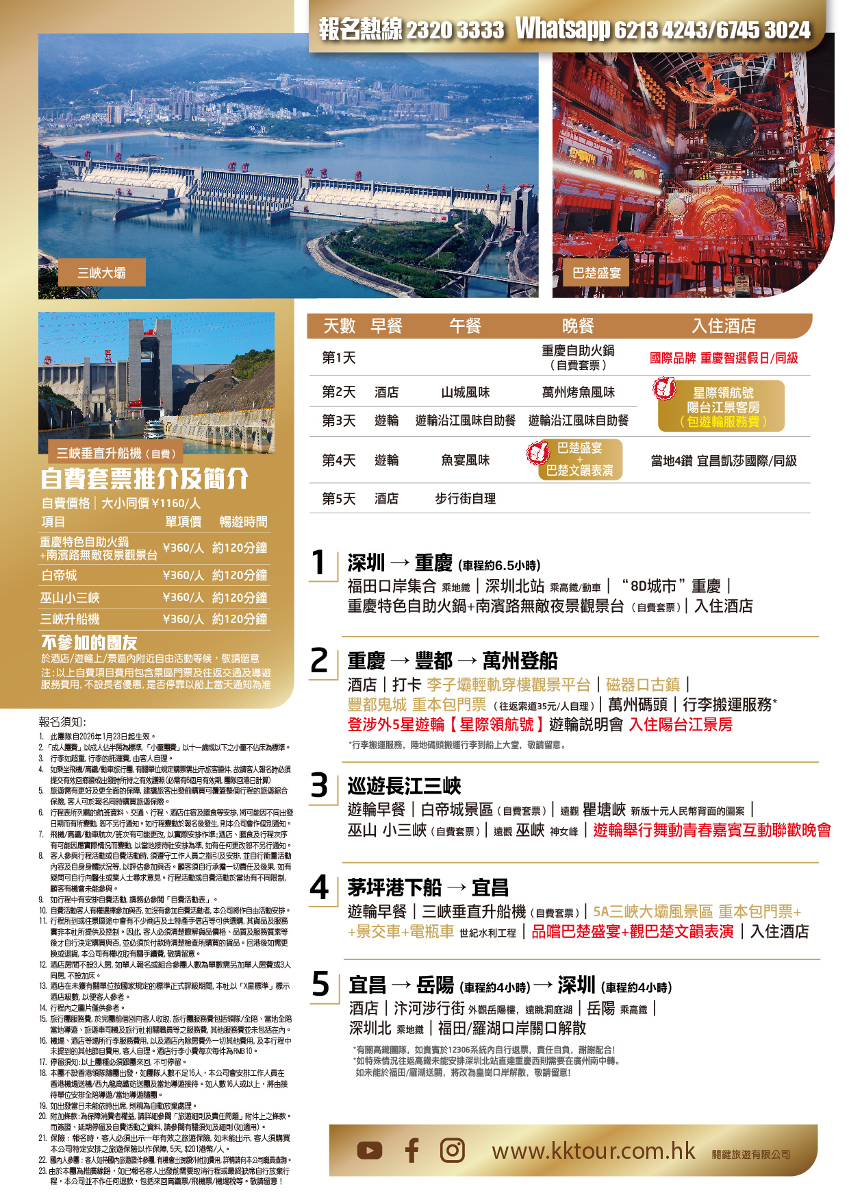 早餐→《白帝城景區》(自費套票)→遠觀【瞿塘峽】新版十元人民幣背面的圖案→巫山《小三峽》(自費套票)→遠觀【巫峽】神女峰→遊輪舉行舞動青春嘉賓互動聯歡晚會