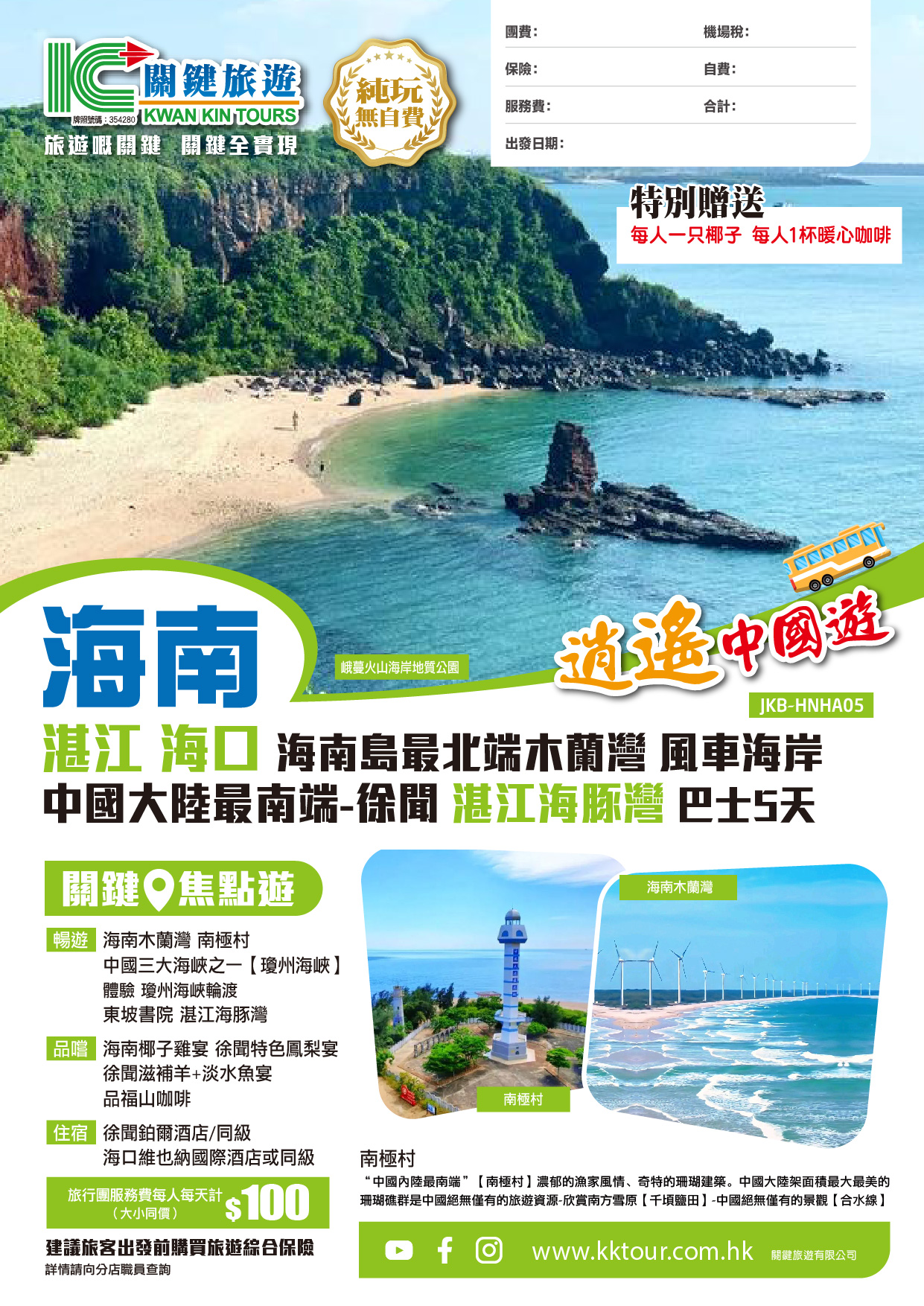 純玩 海南中國大陸最南端-徐聞 南極村 海南島最北端木蘭灣 風車海岸 品福山咖啡 湛江海豚灣巴士5天