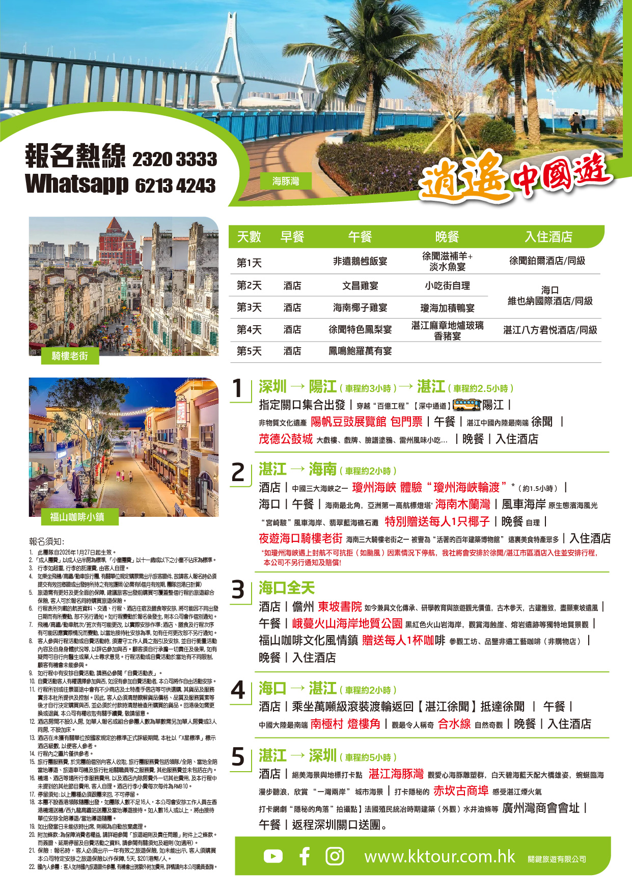 備注:如瓊州海峽遇上封航不可抗拒(如颱風)因素情況下停航,我社將會安排於徐聞/湛江市區酒店入住並安排行程,本公司不另行通知及賠償!