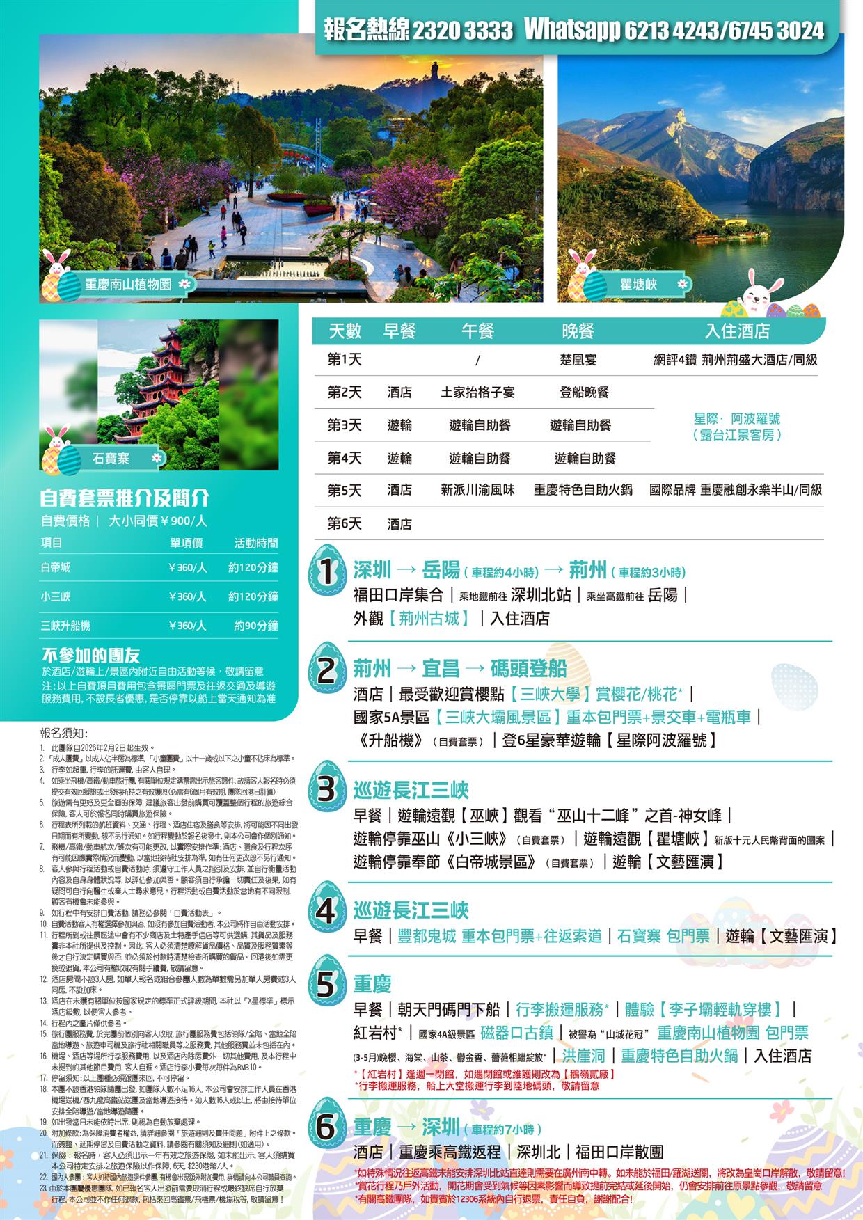 早餐→朝天門碼門下船→行李搬運服務*→體驗【李子壩輕軌穿樓】→【紅岩村】*→國家4A級景區【磁器口古鎮】→被譽為“山城花冠”【重慶南山植物園】包門票 (3-5月)晚櫻、海棠、山茶、鬱金香、薔薇相繼綻放*→網紅打卡【洪崖洞】→【重慶特色自助火鍋】→入住酒店