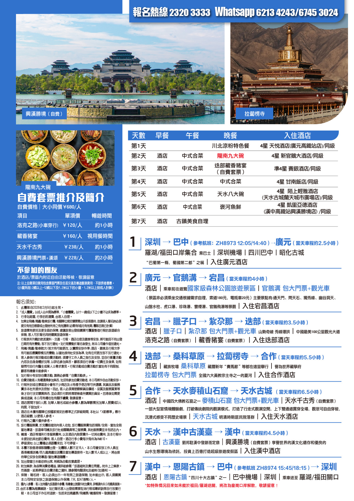 早餐:酒店 午餐:中式合菜 晚餐:隴南九大碗