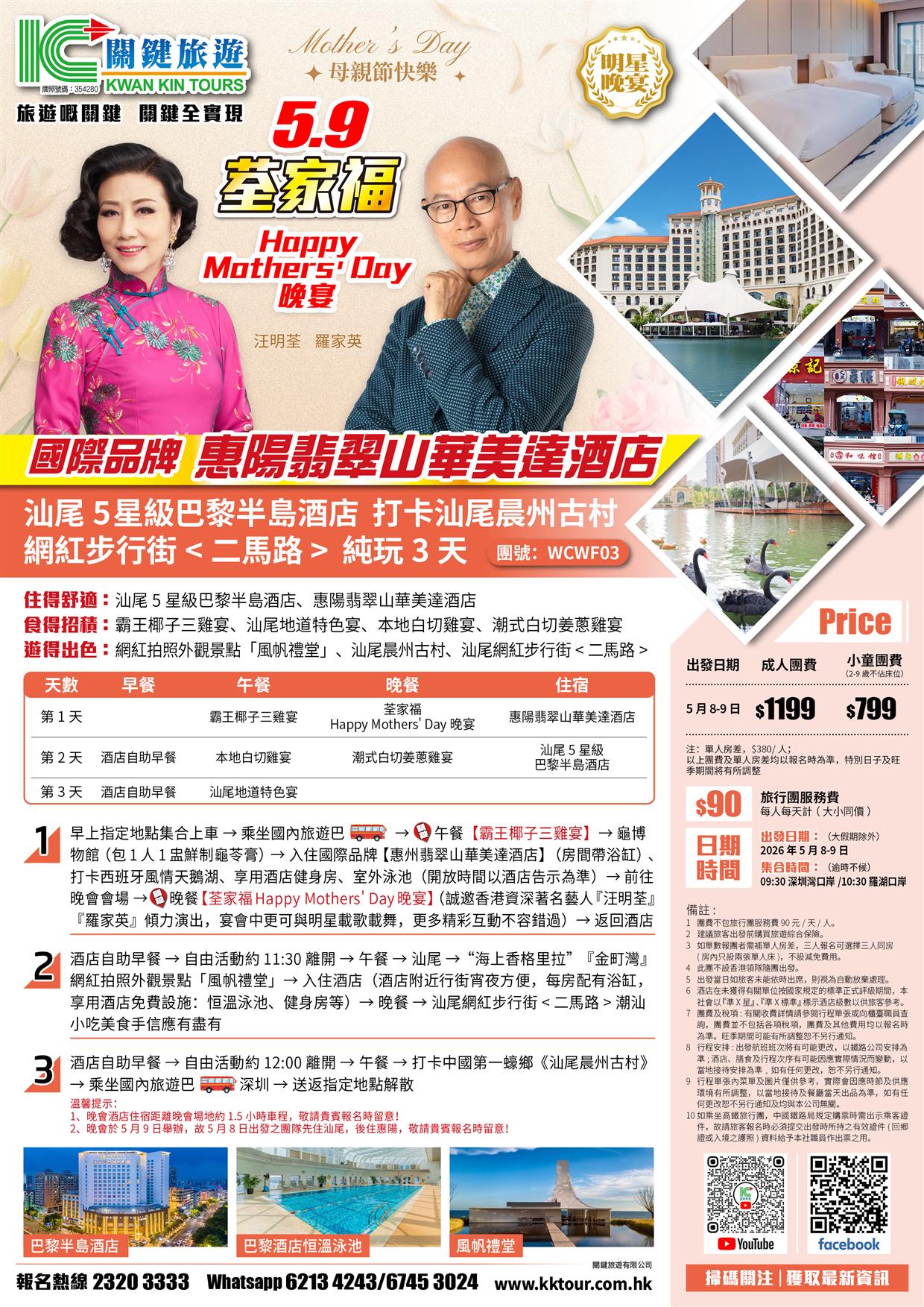 5.9荃家福Happy Mothers Day 惠陽翡翠山華美達酒店+汕尾巴黎半島酒店 純玩3天