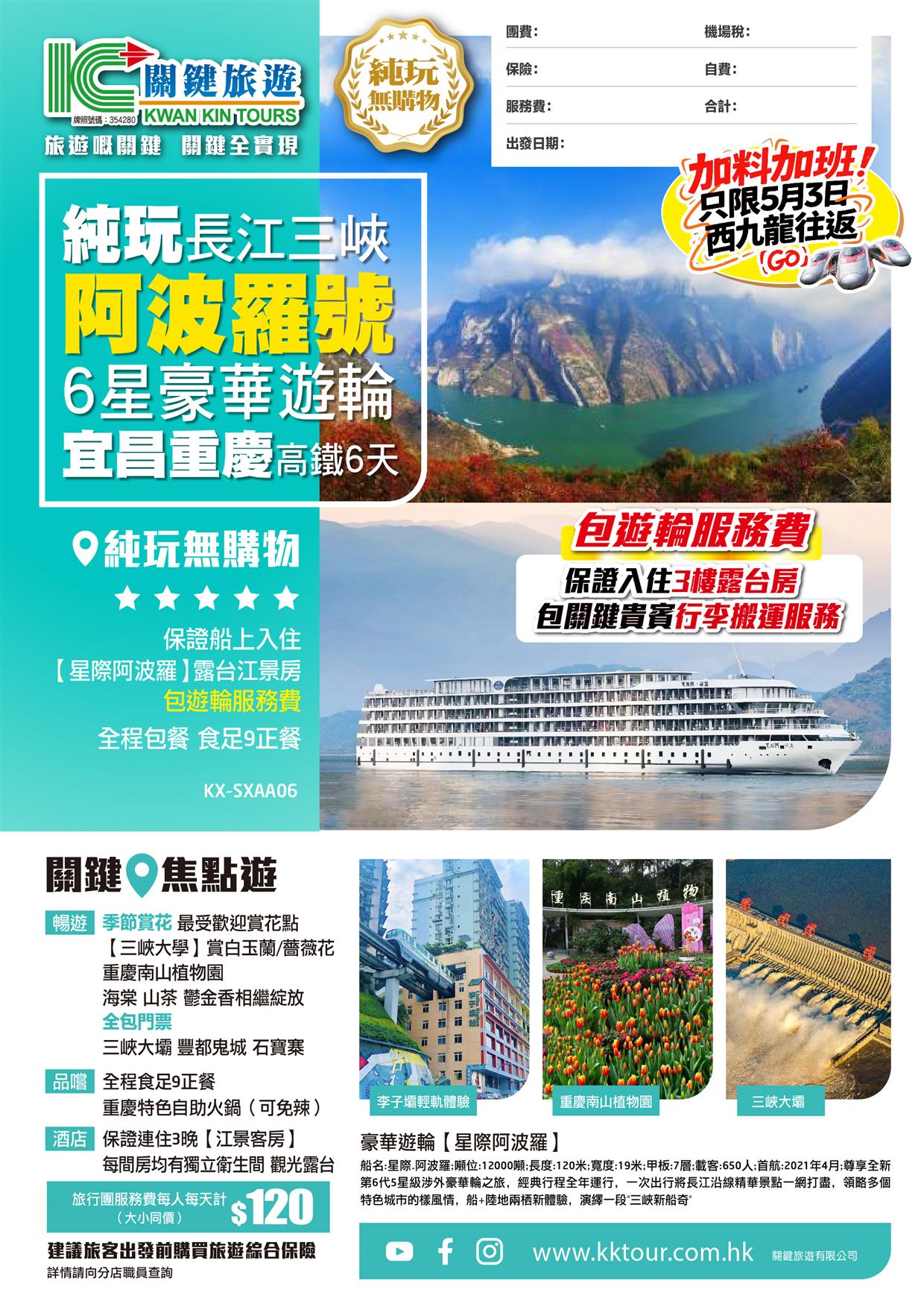 (西九往返)純玩【長江三峽】6星豪華遊輪《阿波羅號》保證入住3樓露台房 宜昌重慶 高鐵6天