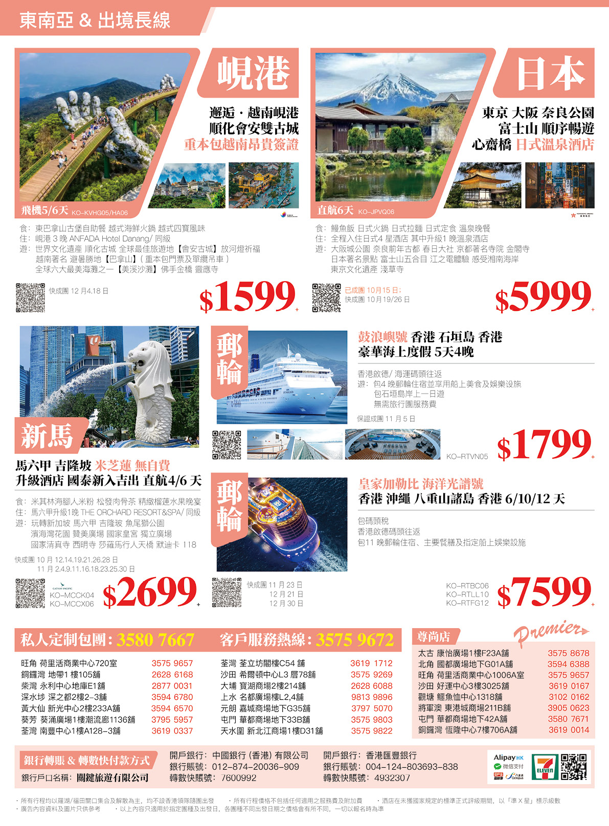 熱線電話 : 2320 3333 旅遊咨詢 WhatsApp : 6745 3024 / 6213 4243